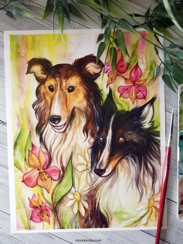 Shetland sheepdogs, Peruvian lilies (alstroemeria), and daisies.